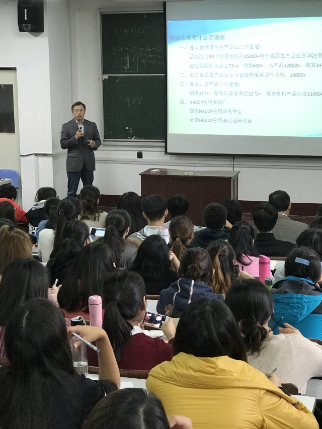 首先,牟海津副院长介绍了主讲嘉宾顾绍平主任负责的相关工作,并说明了顾主任身为海大校友与我校的渊源。本次讲座主要分为两个环节:出口食品企业内外销“同线同标同质”要求的介绍和几所典型企业的工作开展情况。讲座伊始,顾主任介绍了其所在部门——国家认监委注册管理部的主要职能,其中一项重点工作就是HACCP的应用和推广。随后,顾主任说明了“同线同标同质”的含义,即企业生产出口和内销产品时使用同一条生产线、同样的标准,生产同样质量的产品,他还提到国务院正大力推行供给侧结构性改革,使境外消费回流,转变消费者“进口的都比国内好”的观念。顾主任举了大菱鲆的例子,内地出口到香港的大菱鲆全都符合安全标准,但内销的产品因为生产者为预防病害添加了违禁药物而无法做到优质优价。