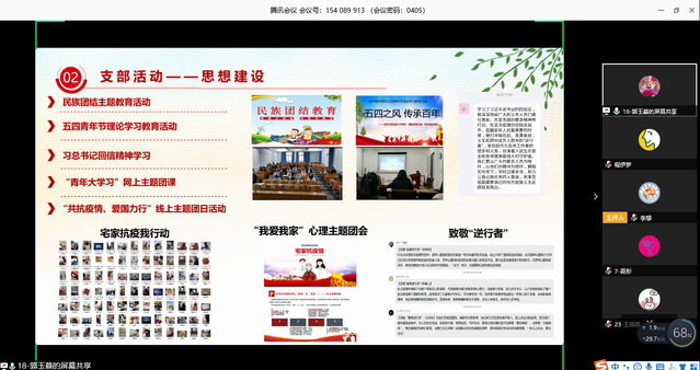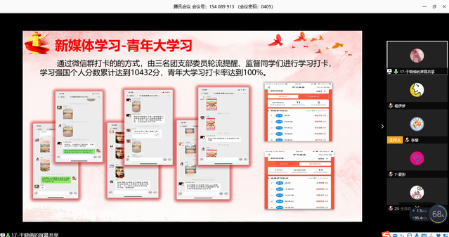 本站讯 4月5日下午,枫林网 (以下简称“食品学院”)2019年度团支部达标升级线上答辩交流会在腾讯会议顺利召开。食品学院团委书记李想,团委委员张川、曹亚楠、屈跃宽、王新磊、程伊梦(2019级食品科学与工程专业硕士)及来自学院全体团支部的25名团干部参加了此次会议,程伊梦担任会议主持。