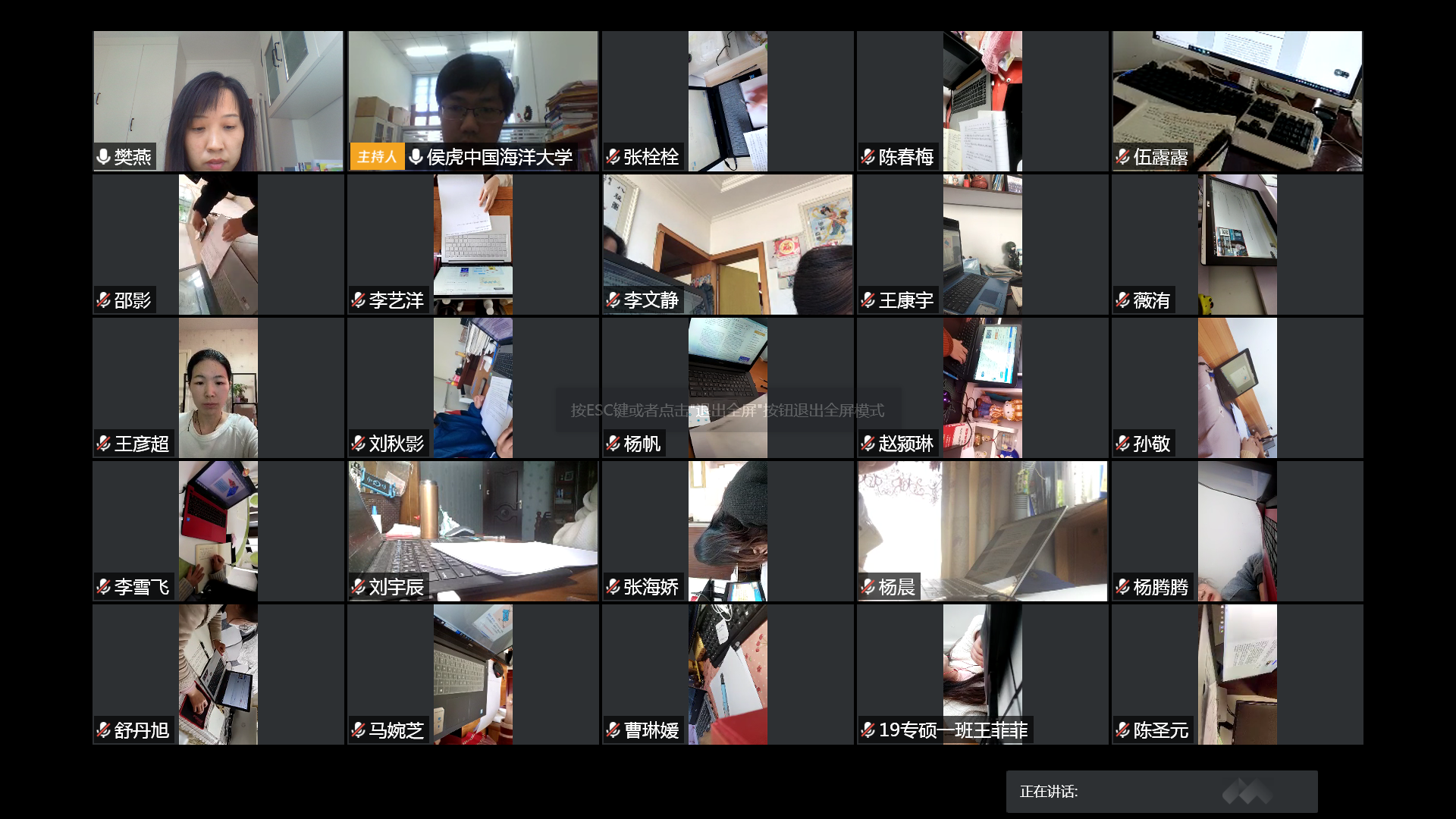 任课教师侯虎老师在Bb平台在线发布考试题目,学生在答题纸上书写答案并上传,监控教师樊燕、王彦超采用腾讯视频实时监控每个学生考试情况,针对学生考试情况随机放大学生图像进行监控,并通过语音实时调整学生监控画面,在线考试进展一切顺利。