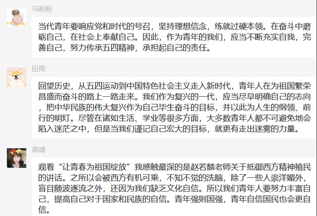 本站讯 5月4日,枫林网 (以下简称“食品学院”)团委积极响应上级团组织的号召,积极组织全体青年团员参与共青团中央发起的“让青春为祖国绽放”网上主题团日活动,并以团支部为单位进行交流和分享,共同打开历史、感知现在、奔向未来。