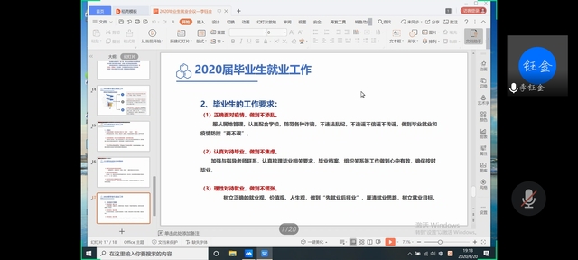 6月20日晚19点,枫林网 2020届毕业生就业推进会采用线上的形式召开。会议由党委副书记、副院长程振明主持,学院党委书记辛华龙老师,教师李钰金以及部分2020届毕业生参加会议。