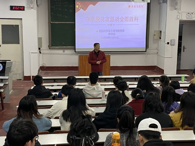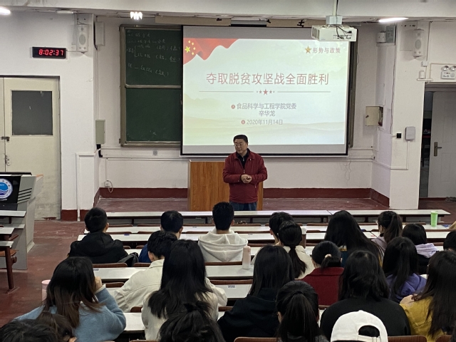 本站讯 11月14日上午,学院党委书记辛华龙以《夺取脱贫攻坚战全面胜利》为题为本科生上形势与政策课。学院专职辅导员张川、吴佩伦旁听了课程。