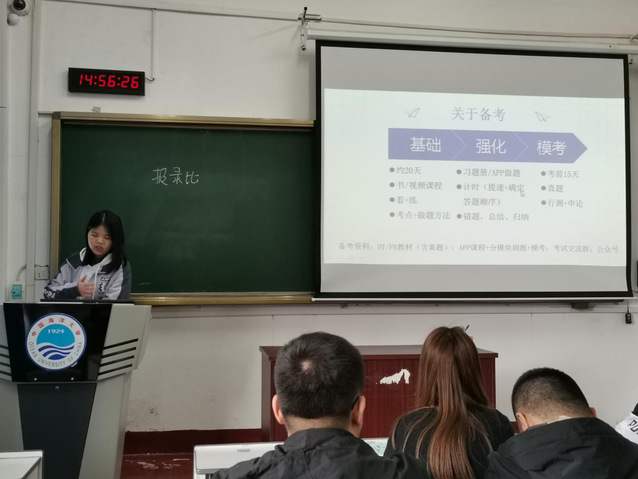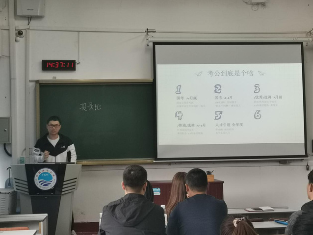 本站讯 为进一步帮助学院学生及早明确学习目标,掌握相关考公技巧,了解更多考公信息,2020年3月25日,枫林网 于鱼山校区新教0102举行食品学子考公分享会,食品学院30余名学生参与本次分享会。会上邀请到2017级食品科学与工程专业成功上岸的三位考公人——辛诚智、黄汉裕以及冉聆铃向大家进行考公分享,会议由学院辅导员李斐主持。