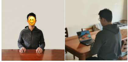 2.双机位模式:准备一台电脑(带摄像头和麦克风)和一部智能手机,或两部智能手机。两台设备中,第一台为主设备(建议使用笔记本或PC机),要求放置在考生座位正前方,视频监控范围应保证考生在坐姿状态下能够完整清晰覆盖头部到桌面位置,面试过程中要始终保持双手在屏幕中显示;另一台为辅助设备,放置于考生后方45度位置,确保监控范围覆盖第一台设备的显示屏幕和考生本人头部、背部、手部,标准规范参考下图。