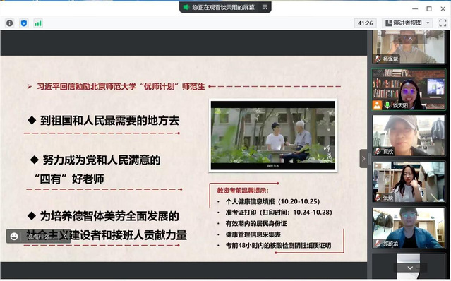 会上,团支书谈天阳以“优师计划”为例向同学们讲解了新时代青年教师的责任担当。青年教师要有坚定的理想信念,用切实可行的方法引导青年学生学习科学文化知识,引领青年学生热爱中国文化,激发青年学生学习科学文化知识的信心和勇气。教师资格证考试时间在即,谈天阳借此机会叮嘱教资考生们提前准备好身份证、个人信息填报表等考试必备材料,以平和的心态积极应对考试,不畏艰难,勇攀高峰。