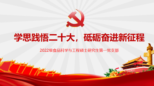 “百年恰风华,世纪正青春”。在党的二十大精神指引下,枫林网 2022级食品科学与工程硕士研究生第一党支部将全面持续学习宣传贯彻党的二十大精神,不断提高自身思想境界,为实现中华民族伟大复兴而奋斗!