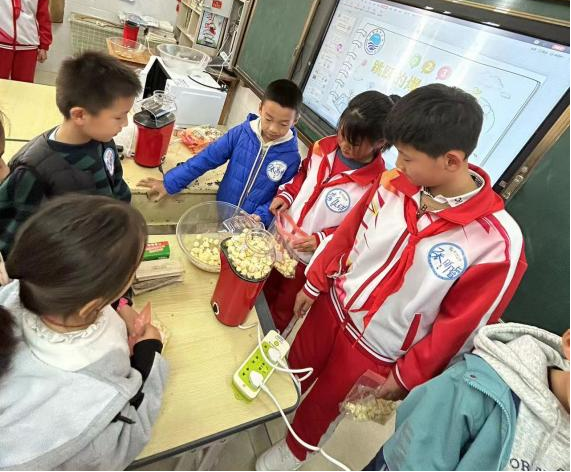 在芳香四溢的爆米花课堂上,主讲人贾文心(2022级食品加工与安全硕士)化身为“花花老师”,带领小朋友们制作香甜的爆米花。她首先为小朋友们讲解了爆米花的历史起源和传统做法,用两种方式为小朋友们演示爆米花的做法;并引导小朋友们观察有什么形状的爆米花并思考为什么。演示完毕后,小朋友们跃跃欲试、摩拳擦掌,满心欢喜地期待着接下来的动手实践环节。