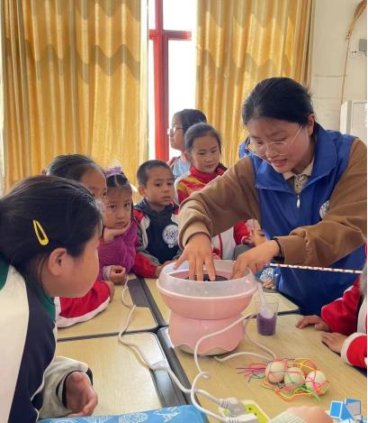 随后,张千禧为大家介绍了棉花糖机器的构造及动手操作时的注意事项,并为小朋友们进行了棉花糖制作演示。小朋友们根据自己的喜好挑选不同颜色的蔗糖,在助教指导下独立动手实践,体会亲手制作棉花糖的乐趣。