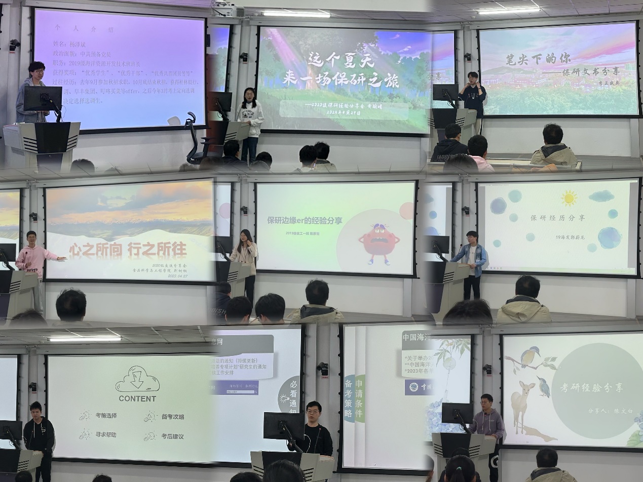 交流会分为保送本校、保送外校、考取本校、考取外校、研究生支教团、企业就业、考公考编等7个专题,优秀毕业生代表们依次进行了分享。首先由保送本校和外校的四位同学,陈素雪、郭蔚龙、黄瑜晴、李正盛奥分别就保研本校与外校的区别和注意事项做了详细介绍,他们从保研资格、夏令营和预推免、本部或三亚校区、选校择师和科研竞赛等方面展开分享,鼓励同学们磨砺以须,为保研打下厚基础和硬实力。紧接着,由考取本校和外校的三位同学张翔波、胡申、陈文白从全国硕士研究生招生考试的时间安排、重要节点、备考方法、院校选择等方面作了经验交流,同时结合自身备考经历向大家介绍了在备考过程中需要注意的相关事项。接下来,韩霖、管小龙结合自己的个人经历,从自我认知、简历设计、投递技巧、面试心得、最终抉择等方面对求职就业经验进行详细介绍,并鼓励同学们要增强自信,以平稳的心态面对竞争激烈的求职道路。最后,杨泽斌为大家介绍了“什么是选调生”,选调生的特点及考试介绍,并提出了备考建议,同时提醒同学们要关注时间节点,令同学们获益颇丰。
