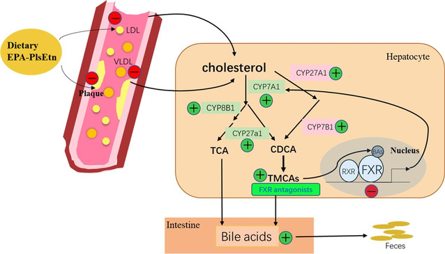 相较于乙酯型EPA,EPA-缩醛磷脂能够更有效地通过降低血胆固醇水平抑制动脉粥样硬化发展。机制研究表明,膳食摄入EPA-缩醛磷脂能够促进肝脏将多余胆固醇异化为胆汁酸通过粪便排出体外,而这一过程与肠道菌群重构及其对次级胆汁酸的代谢有关。肠道菌群能够改变次级胆汁酸组成,进而通过肝-肠轴影响肝脏中胆汁酸受体FXR的表达,从而促进胆固醇7-羟化酶(CYP7A1)合成胆汁酸,将体内多余胆固醇排出体外,最终减少循环胆固醇水平,减轻动脉粥样硬化斑块蓄积。