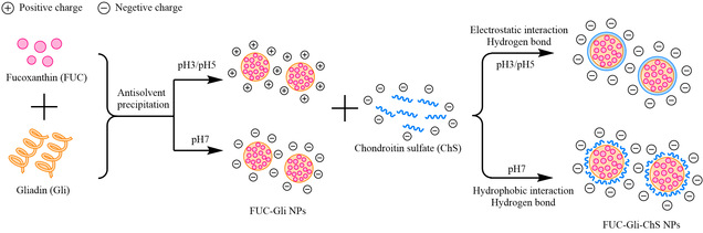 尽管岩藻黄素(FUC)具有抗氧化、抗癌和抗炎等多种生理活性,但其低水溶性、对光和热的高敏感性等限制了其在功能性食品和饮料中的开发和应用。为了更有效地发挥FUC的有益功效,有必要利用蛋白质-多糖相互作用形成复合物构建一种合适的递送载体来提高FUC的水分散性,以扩大其应用范围。麦醇溶蛋白(Gli)作为一种醇溶性蛋白可用于疏水性生物活性成分的递送,但其易聚集、稳定性差,而硫酸软骨素(ChS)作为一种从动物软骨中提取的粘多糖,具有较强的负电荷和较好的生理活性,可以与带正电荷的蛋白相互作用形成复合物,以改善蛋白质纳米颗粒(NPs)的稳定性。