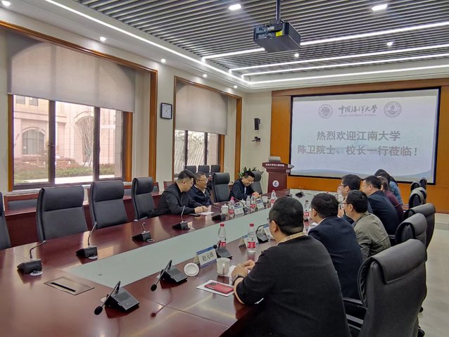 毛相朝对陈卫一行的来访表示欢迎,并详细介绍了学院的建设和发展情况。他表示,学院长期以来立足海洋食品特色,努力打造世界一流、特色显著的食品学科。江南大学食品学院的发展经验、学科建设以及科学研究等方面为我院高质量发展提供了宝贵经验,希望双方未来能够围绕大健康和大食品,充分发挥两校之间优势互补、资源共享,实现互利共赢。