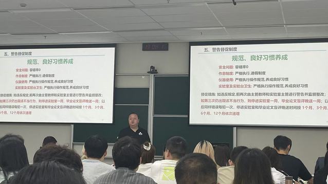 会上,高昕详细阐述了食品专业研究生的相关管理规范条例,重点围绕日常考勤、仪器设备管理、实验室安全及卫生制度、警告督促制度等多个方面与学生进行了深入的解答与互动。他强调这些规章制度对于保障科研工作的顺利进行以及同学们个人成长的重要性,并殷切地勉励同学们要秉持自律精神,遵循规范化的科研生活方式,勇于面对挑战,善于把握机遇,为食品平台的发展贡献自己的智慧与力量。