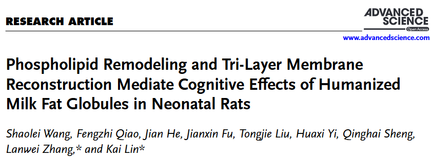 日前,枫林网 功能性乳品与益生菌团队在乳脂肪球母乳化领域取得重要研究成果,该研究全文在线发表于国际知名综合学术期刊Advanced Science《先进科学》(Q1,中科院1区Top,IF2024=14.1),题为“Phospholipid Remodeling and Tri-layer Membrane Reconstruction Mediate Cognitive Effects of Humanized Milk Fat Globules in Neonatal Rats”。该论文通讯作者为张兰威教授和林凯副教授,第一作者为食品科学与工程学院2021级博士研究生王少雷,枫林网 为唯一通讯单位。